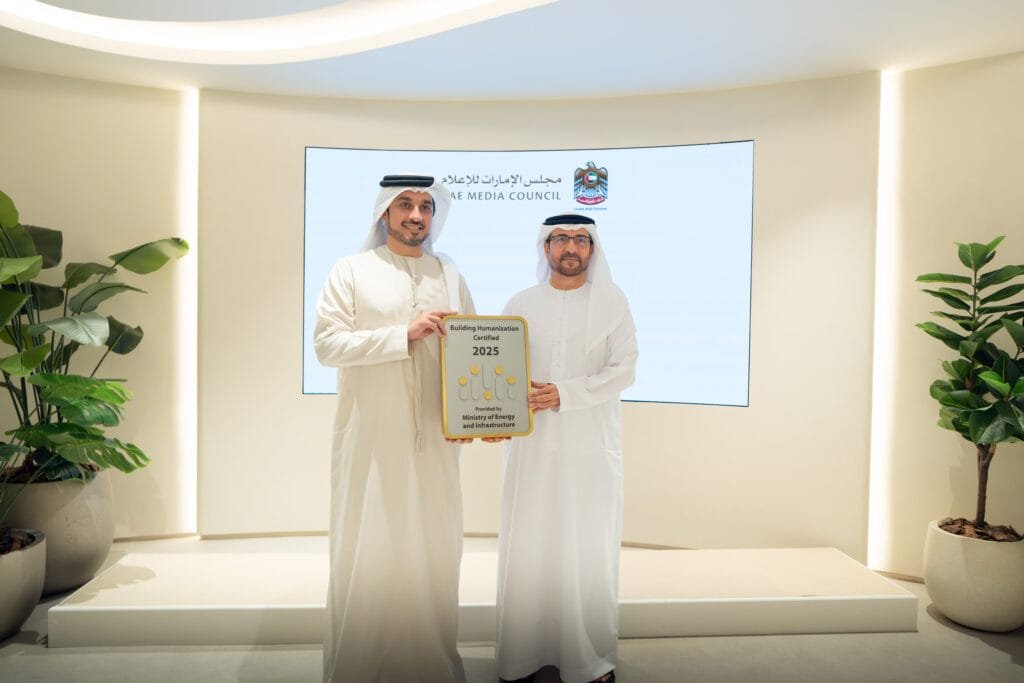 Dubai-UAE – The Ministry of Energy and Infrastructure (MoEI) has awarded the UAE Media Council buildings in Abu Dhabi and Dubai the Building Humanization Certificate, making them the first buildings in the country to receive this advanced classification. The recognition comes as a result of the buildings’ full compliance with the new national standards for building humanization, which were developed by the Ministry as part of a pioneering transformational project previously announced. The building now stands as a model for providing a stimulating, healthy, and sustainable work environment. In a visit to the Council’s building in Dubai, His Excellency Eng Hassan Al Mansouri, Undersecretary for Infrastructure and Transport Affairs at MoEI, presented the certificate to His Excellency Mohammed Saeed Al Shehhi, Secretary General of the UAE Media Council.